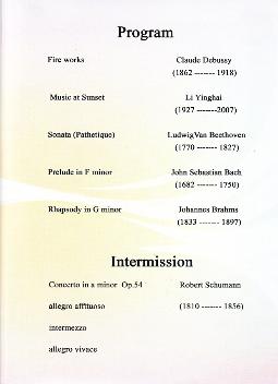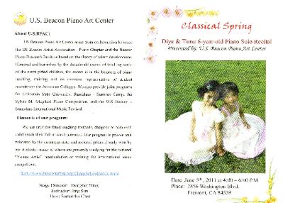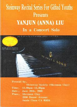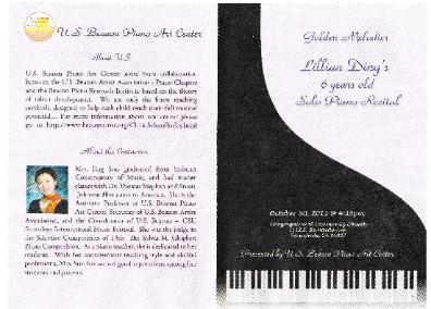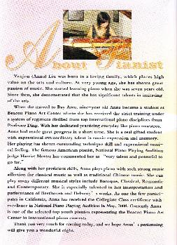| List of Students for Solo Recital 2015 Nov. 7 Annie Lee Emmi Wong 2014 March 8 Rachel Yang June 1 Karin Lou Maggie Yan Tiana Zhou Nov. 11 Andrew Zheng Irene Chen 2012 Feburary 14 Karin Liu Feburary 27 Andy Liu 2011 October 30 Lillian Ding Septemeber 25 Samantha Chan Brian Lin June 27 Conway Qu June 5 Tiana Zhou Diya Iqlas 2010 December 5 Jaya Brown September 11 Angela Tsang 2009 May 31 Arthur Chen March 15 Leo Kang 2008 September 26 Willam Dong June 27 Karey Shi Kelly Shi June 24 Janice Chan Ryan Yu June 20 Anna Liu Susie Zhang April 14 Alex Thoi Lilian Thoi January Leo Kang 2007 Emily Yang Bryant Cong Andrew Lam Rachael Ye Ryan Higgins 2006 October 15 Authur Chen May 13 Daniel Xu 2005 August 28 Max Chung March 19th Susie Zhang Janurary 25 Kelly Shi 2004 December 1 Karey Shi March 13 Norinal J. Kham February 29 Noel Wan 2003 October 6 Joy Wan April 27 Ryan Yu April 1 Max Chung 2001 May 6 Wenwen February 17 Eryn Mai 2000 Joy wan Noel Wan Michelle Lang 1999 Ann Nguye |